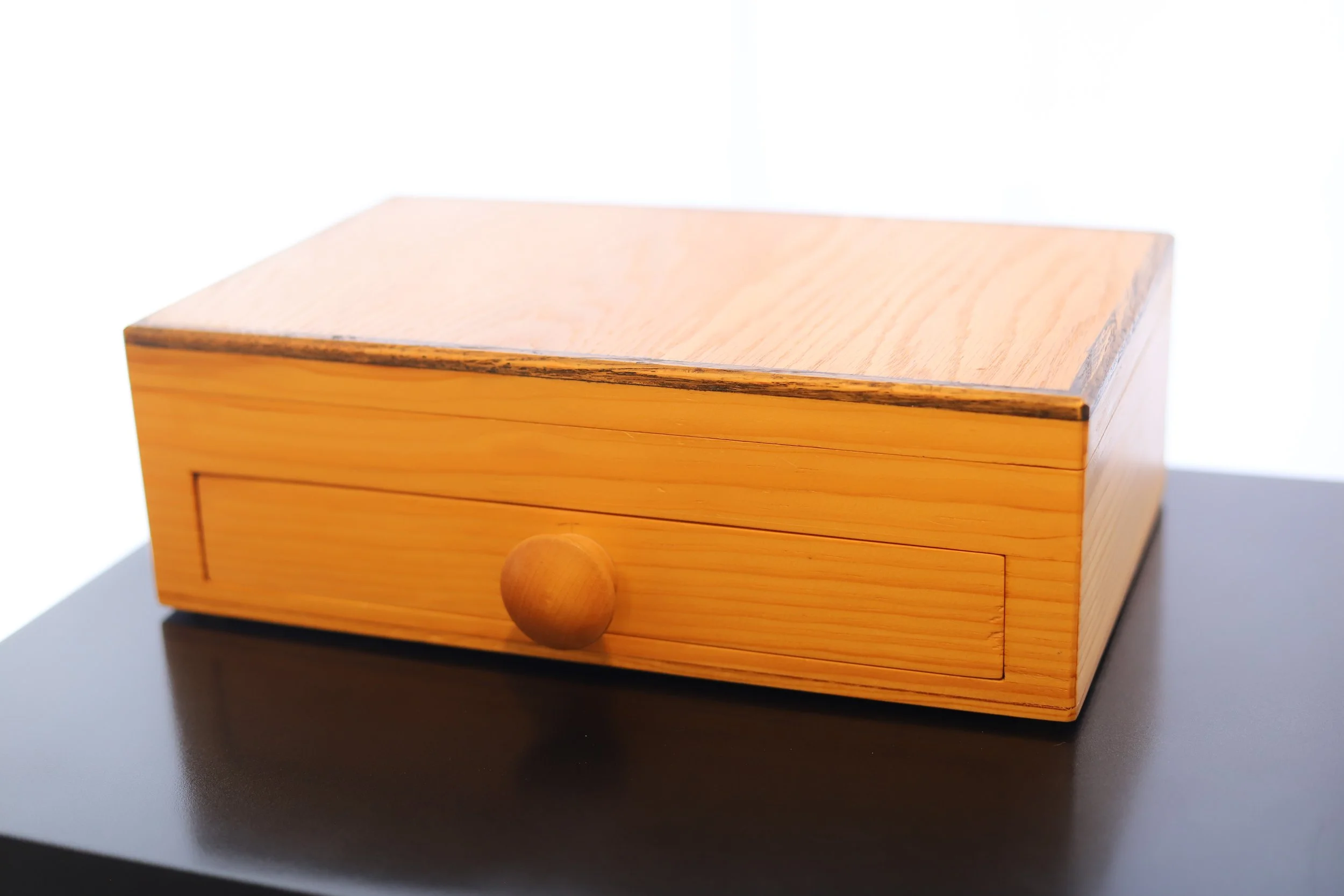 I created this jewelry box as a prototype. It is made of pine with oak veneer on the lid and a stained oak border around the lid. I liked the prototype, so now I use it for my every-day items.